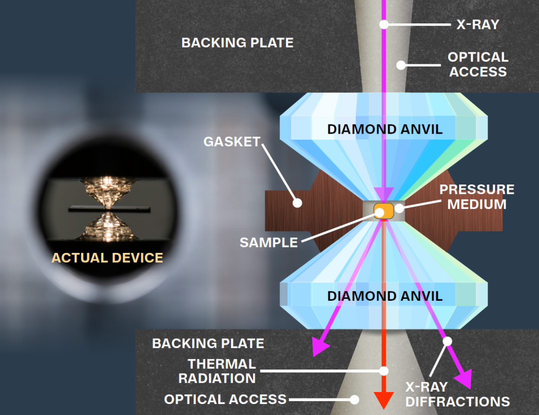 而这次为了创造新的记录,Dias 在罗彻斯特大学的实验室将氢、碳和硫元素,在一个金刚石压腔中(用于在极高压下极微量材料的实验装置)通过光化学合成简单的碳质硫氢化物,将可以实现零电阻的温度提高到了 15 摄氏度。