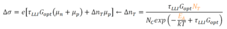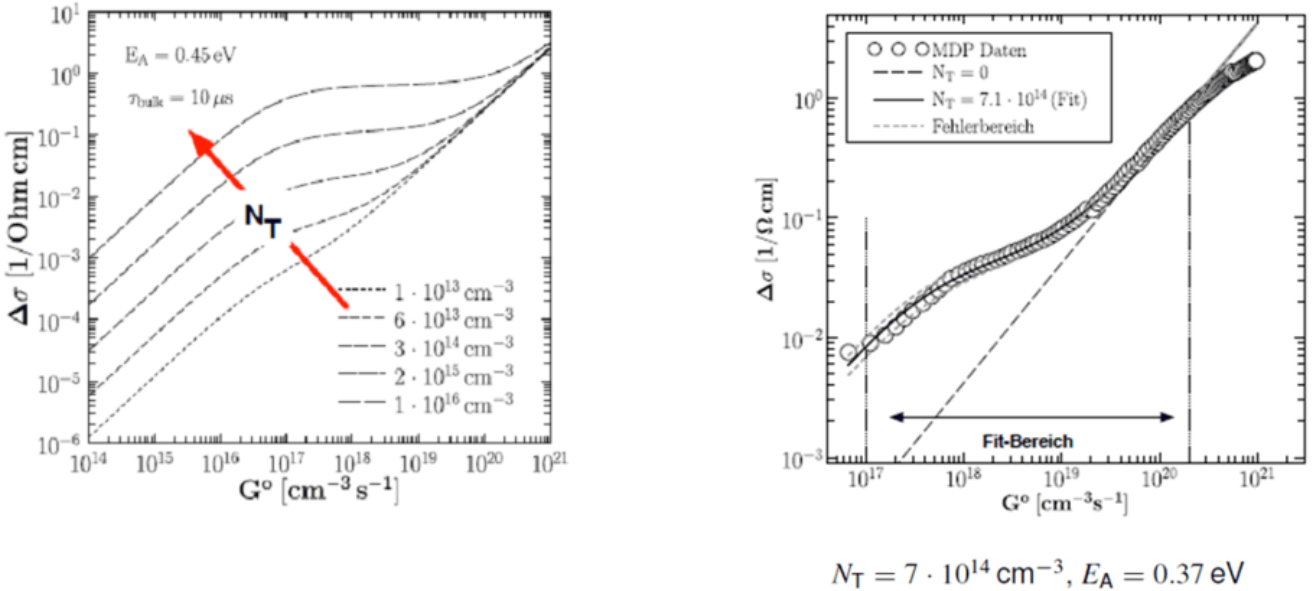 根据注入相关寿命曲线,可以确定低注入下的寿命τLLI,并且光电导率与修正后的HORNBECK和HAYNES模型相匹配。其中捕获密度NT和活化能EA是拟合参数。