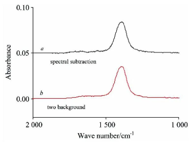 为评判新方法扣除水峰的效果,我们与传统的差谱技术结果进行了对比。以空白锗晶体作参比样品,分别测量了10%碳酸钾和15%氯化钠溶液的红外光谱。选择合适的差减因子,将两溶液的红外光谱进行差减,得到图3a。