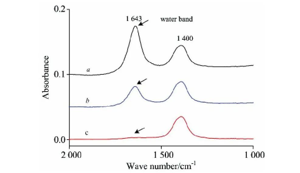 图2是实验结果。1643cm-1为水的吸收峰,1400cm-1为碳酸根(CO23+)的吸收峰。实验中,首先测量了待测样品10%K2CO3水溶液的样品单光束谱,然后按照上面的叙述先用空白锗晶体作参比样品,扫描20次背景谱(空白锗晶体)后,暂停。得到图2a,这时,水的吸收峰(1643cm-1)为正值。在1,2,…,20次扫描累加中,碳酸根和水的吸收峰强度保持不变。暂停后,换上15%氯化钠水溶液参比样品,接着继续扫描背景谱。增加新的扫描次数,碳酸根的吸收强度继续保持不变(因15%氯化钠溶液不含碳酸根)。但每增加一次新扫描,水的吸收就会稍稍减弱些(15%氯化钠溶液含水量大于10%碳酸钾溶液)。当对氯化钠溶液扫描达到48次时,1643cm-1处水峰已明显变小,如图2b所示。每增加一次对氯化钠水溶液的扫描,水的吸收峰都会变得更小。到扫描次数达到300次时,水的吸收峰都消失,这时停止扫描就获得了令人满意的无水吸收峰干扰的红外光谱,见图2c。实验中没有采用差谱技术操作。因此,实际测量时,纵坐标可以采用吸光率,反射率或透光率等单位。