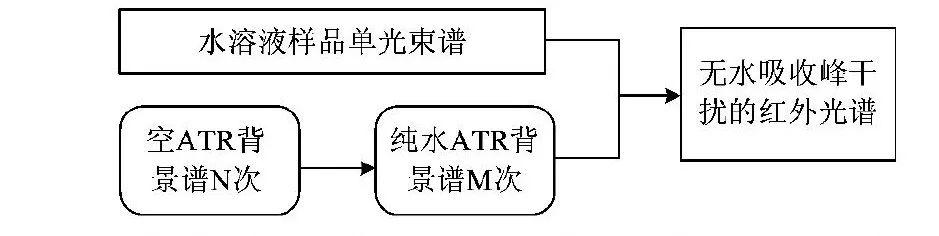 测量红外光谱时,先测量溶液(K2CO3溶液或BSA溶液)的样品单光束谱,再测量参比样品的背景单光束谱。不同于传统的测量方法,采集背景谱时采用了双背景样品。先扫描空的ATR晶体N次(N要足够大),暂停,ATR晶体上注满参比溶液(15%NaCl溶液或纯水),继续扫描,观察红外光谱图,可以看到水的吸收峰由强→弱→消失全过程,获得满意的无水吸收峰干扰的红外光谱时终止扫描。实验路线框图见图1。