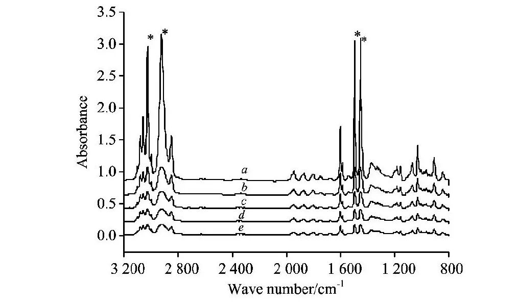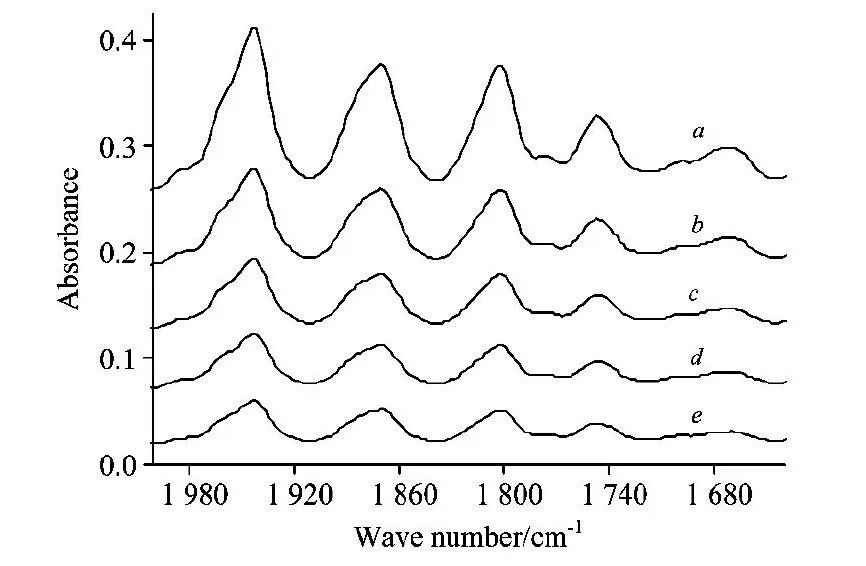 将图4中2000~1640cm-1区域放大,得到图5。从图5b,c,d和e中的谱峰与a中相对应的谱峰比较,强度不同,但峰型失真不明显。2000~1640cm-1区域无强吸收峰,对红外光的吸收小。因此,红外峰的吸光率是影响失真的重要因素。越弱的吸收峰,即吸光率A越小,失真程度越小。越强的吸收,见图4中带星号吸收带,失真越严重。