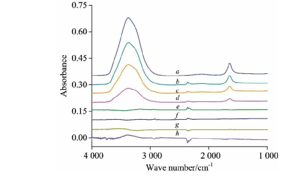 图6给出了水的ATR谱,水和空气的混合ATR谱。图6中所有谱图测量时参比样品均为空白Ge晶体,即锗晶体表面不加任何样品,背景谱累积扫描32次。图6a为水的ATR谱,采集水样品64次。从图6a中,发现在单次ATR附件测量中,水*强峰3400cm-1处的吸光率约为0.3,在1640cm-1处吸光率约为0.075。图6b,c和d中样品谱采集时分别扫描水样品若干次外加扫描空ATR晶体若干次,因此,图6b,c和d中的ATR谱均为双样品(水+空气)混合光谱。