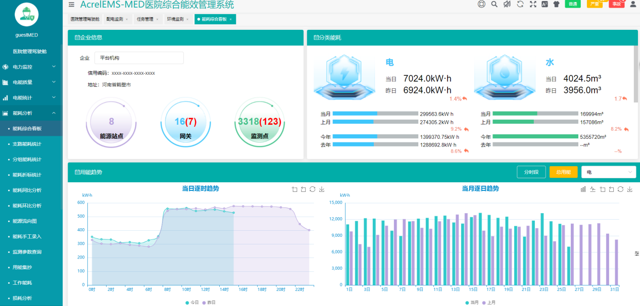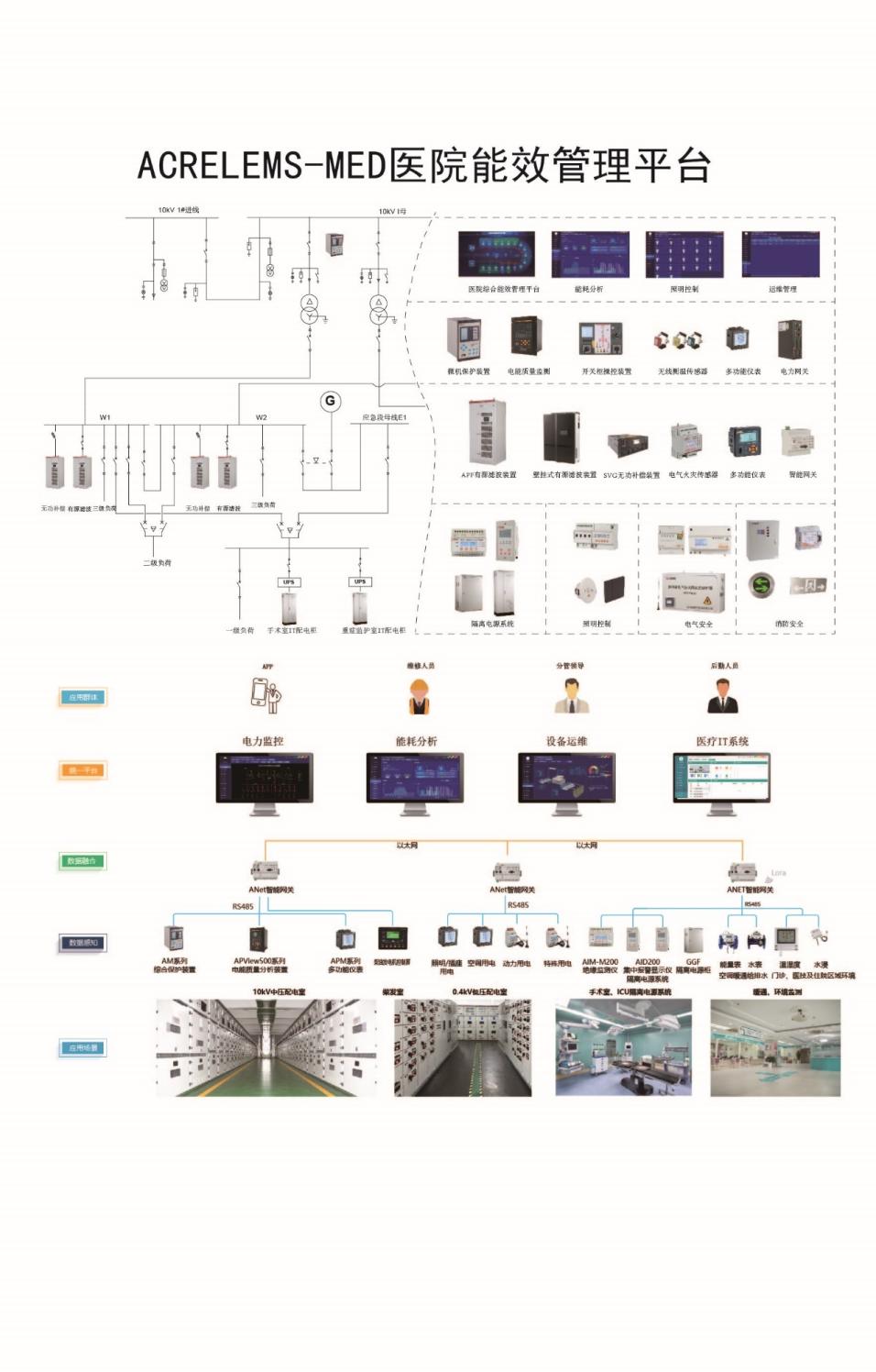 AcrelEMS-MED医院能源管理平台充分结合《医疗建筑电气设计规范》《绿色医院建筑评价标准》、《医院建筑能耗监管系统建设技术导则》等行业规范、根据医院用户需求以及能源管理部门要求,采集分析能源、能耗、能效数据,监测以电能质量、智慧用电相关指标以及其他用能指标,并与国家能源政策与用能模式改革结合。能够辅助医院后勤管理人员进行能源供应系统及设备的运行管理工作,帮助医院管理层实时掌握医院的能耗情况,为医院能源信息化建设和节能管理提供了良好的技术平台。