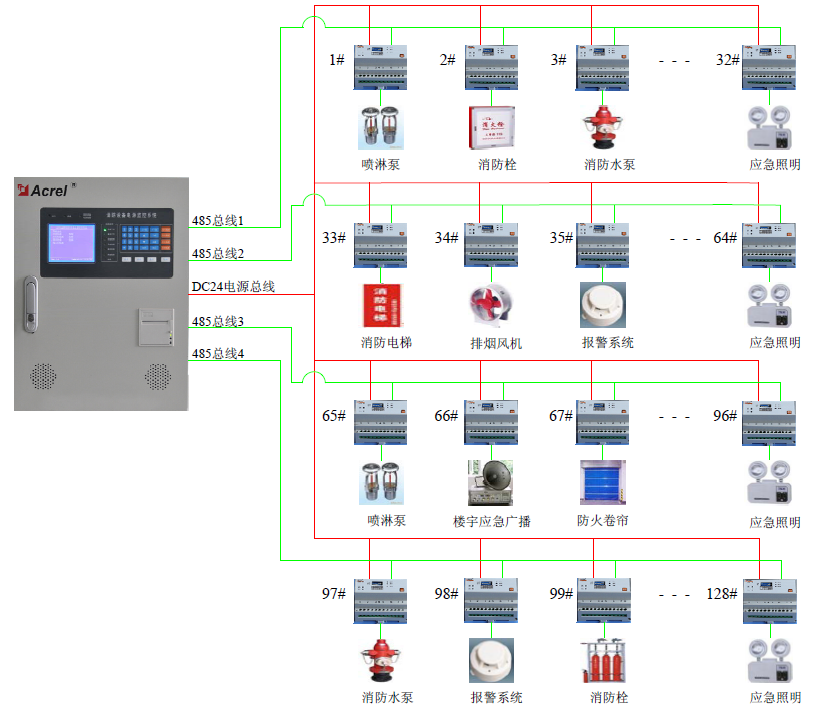 消防设备电源监控监控系统采用消防二总线,以建筑为单位设置区域分机采集消防设备电源状态,区域分机通过二总线接收多台传感器的电压、电流信息和开关状态信息,以此实现对消防设备电源工作状态的实时监视。