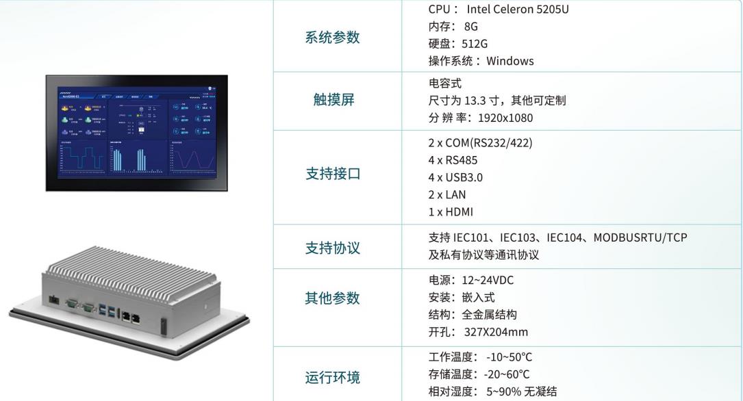 该系统基于13.3寸的工业触摸屏电脑,可嵌入式安装在储能柜的面板上,其中电脑配置是8G内存,512G的固态硬盘,具有强大的数据处理和存储能力。该设备具有多接口(2个网口、4个串口、4个USB口和1个高清接口),1377-443-0992多协议接入能力(支持IEC101、IEC103、IEC104、MODBUS RTU/TCP及私有协议等),可接入不同厂家的PCS、BMS、表计、温控系统、消防主机等。同时支持数据转发,满足储能站统一运维的需求。