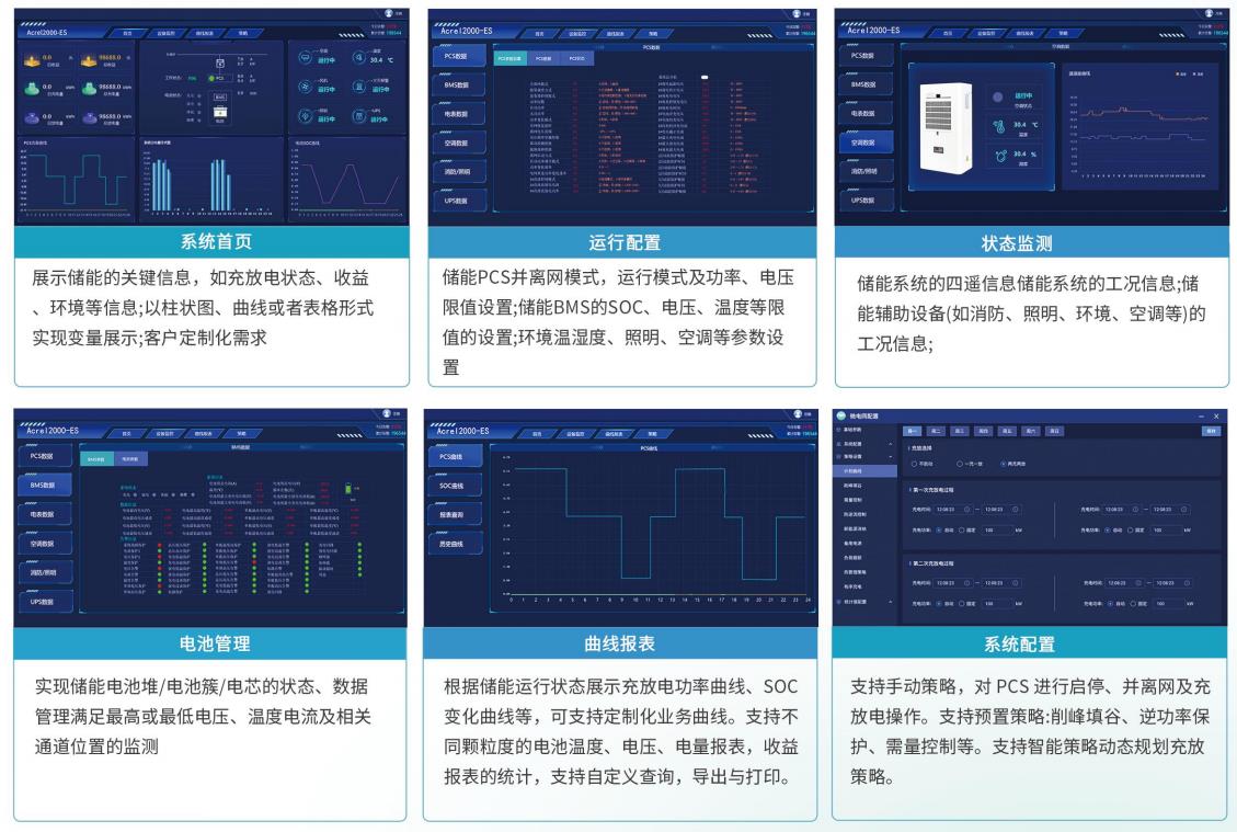 它具有完善的储能监控与管理功能,涵盖了储能系统内部所有设备(包括PCS、BMS、电表、消防、温控、视频等)的详细信息,实现了设备监控制、充放电优化调度、异常告警、数据转发、视频监控、历史曲线、事件查询、报表统计、权限管理等。其中充放电优化调度包含计划曲线、削峰填谷、需量控制、动态扩容、防逆流等控制策略。通过策略配置界面,用户可以根据需求进行选择、1377-443-0992配置所需运行策略,操作简单也是特别简便。