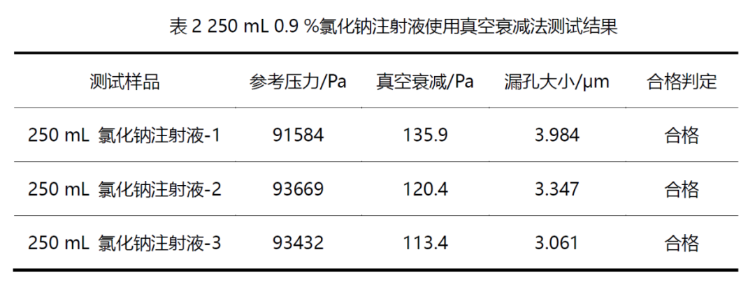 本次测试样品为250 mL输液袋,内容物为 0.9 % 氯化钠注射液,包装内存在常压洁净空气,抽真空可有效建立测试腔与样品包装系统的内外压差,因此选用真空衰减法对样品进行检测。设置有效的测试参数、通过模拟泄漏建立线性关系,测试阴性实体和模拟泄漏进行准确度验证。结果表明,该方法可有效检测250 mL输液袋柔性包装的密封性。