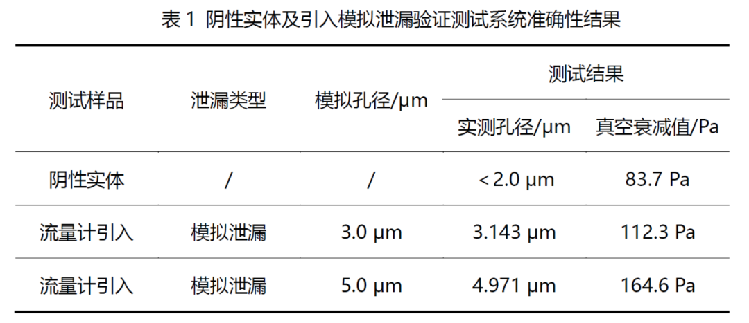 用阴性实体和气体流量计引入已知的泄漏流量,验证测试系统的实测值与流量计的模拟值是否接近以判断包装系统测试结果的准确性,采用与被测样品外形、体积尺寸相同的实心体作为阴性对照样品,放置在根据样品尺寸定制的亚克力夹具中进行测试,真空衰减值测试结果为83.7 Pa,结果判定为无泄漏,以气体流量计模拟3.0 μm和5.0 μm漏孔对应的泄漏流量进行测试,测试结果如表1所示。