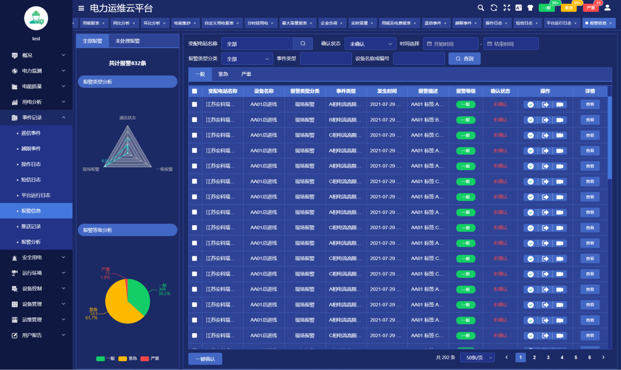 站点监测包括概况、运行状态、当日事件记录、当日逐时用电曲线、用电概况。