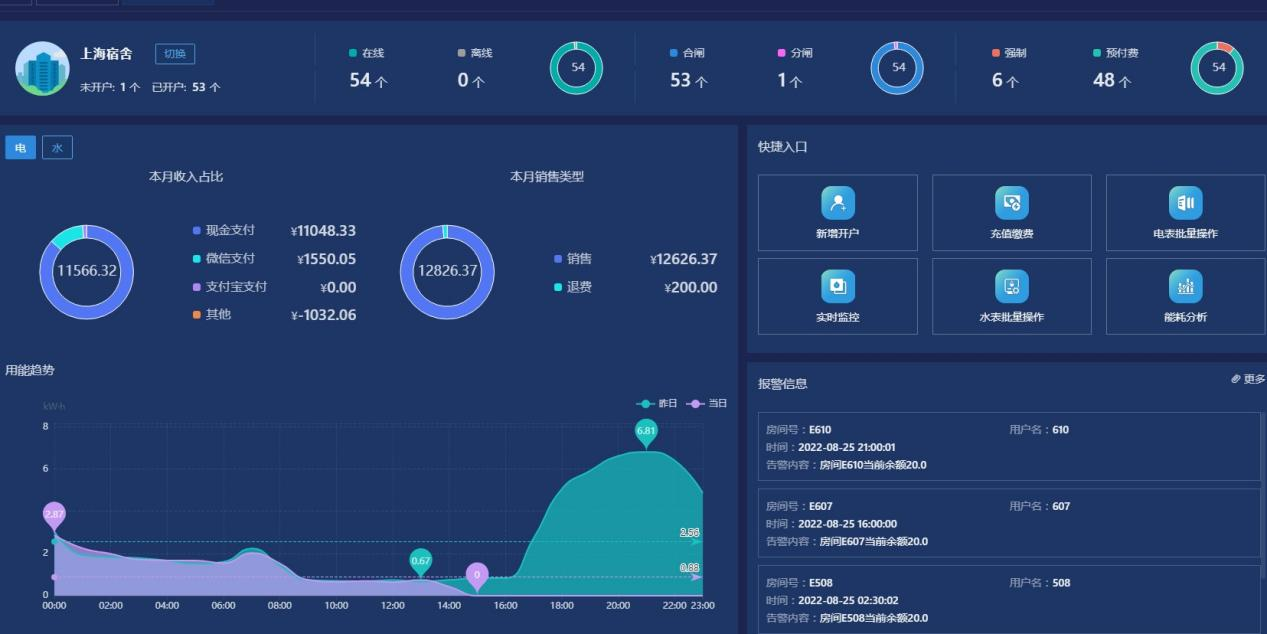 6)报表中心:提供售电、售水财务报表、用能报表、报警报表等查询,本系统所有的报表及记录查询,都支持excel格式导出。