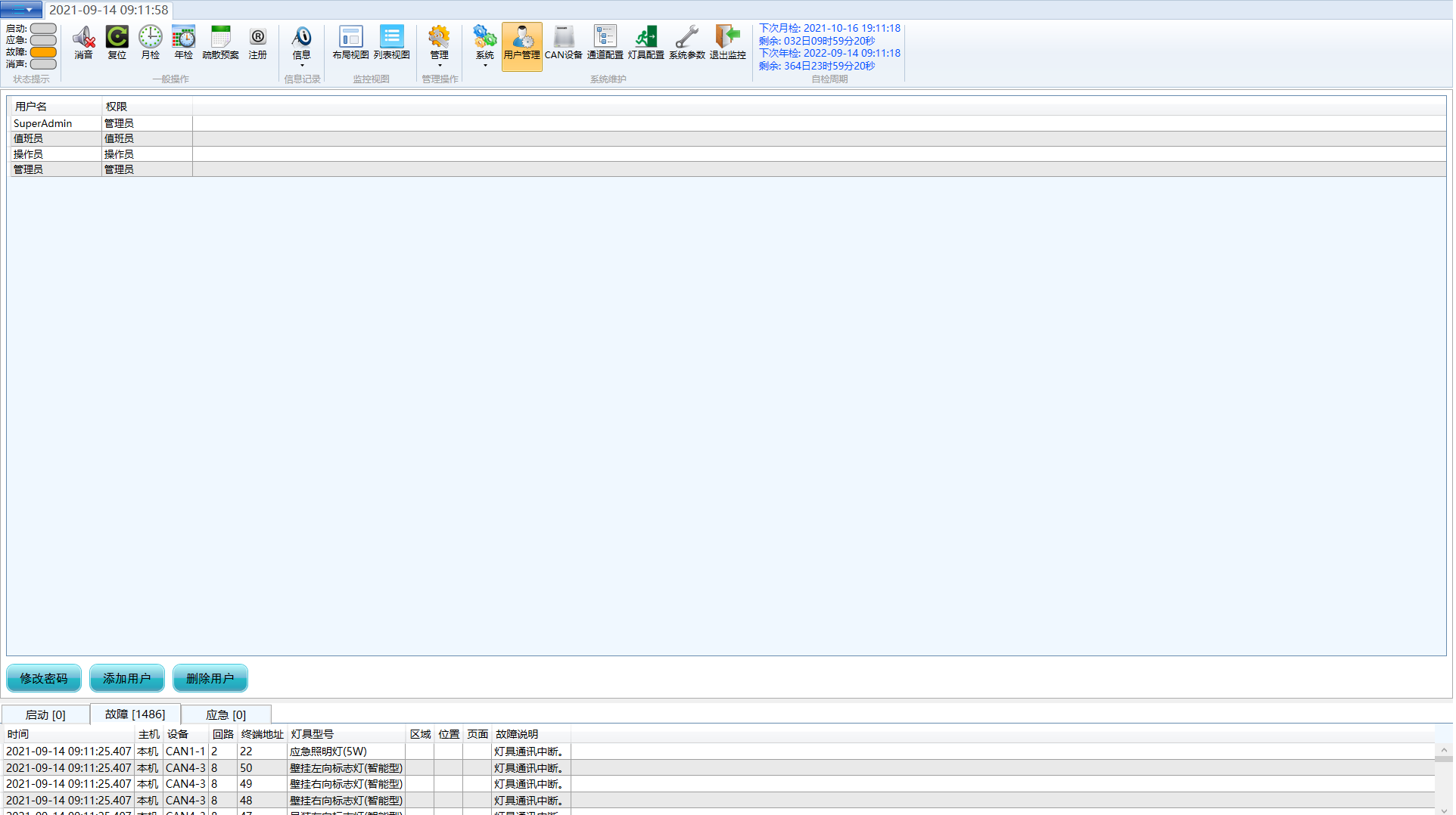 主要由应急启动、应急停止与手动火警组成,应急启动与停止用来测试设备应急功能是否正常,手动火警测试再具体着火点下系统的启动情况。