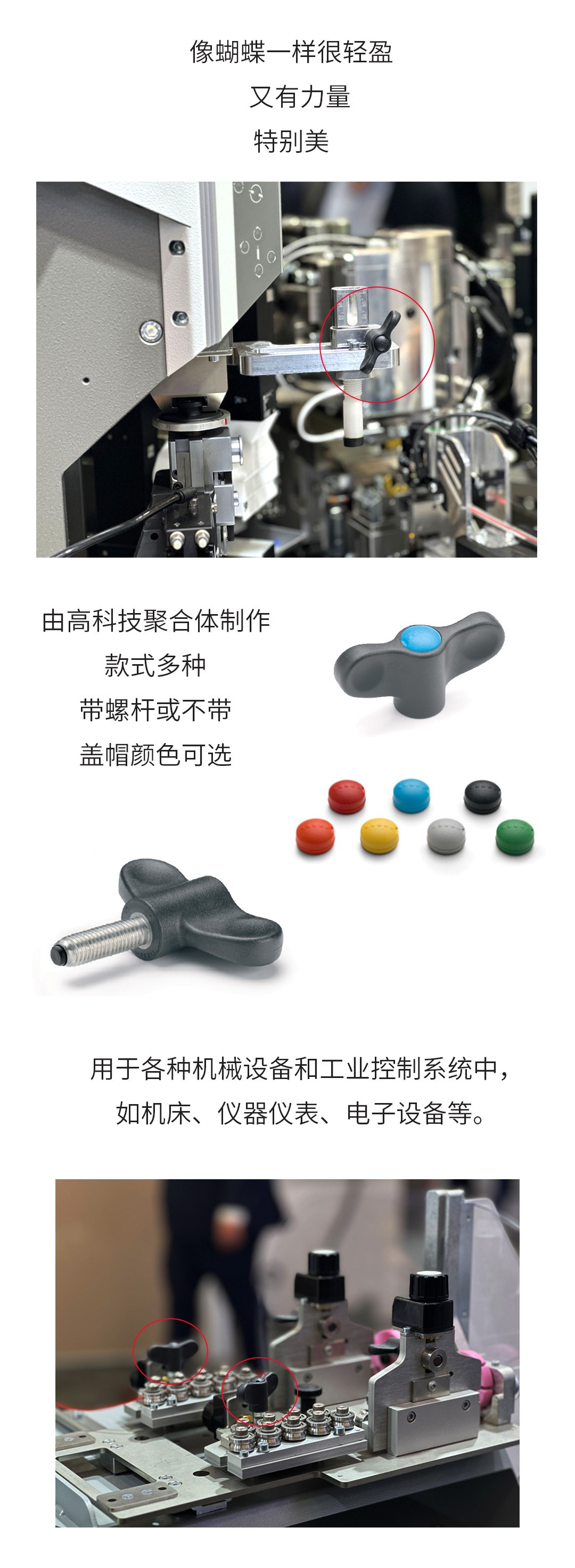 此外,我们还供应特殊功能的旋钮:带限制扭矩机构的旋扭用以保护应用表面;带彩色中心帽的多彩旋钮;带表面吸收振动的柔性触感涂层,升华握持手感的旋扭;RAL 9002白色外观的清洁旋扭系列产品适用于医疗环境,不锈钢金属嵌件或全不锈钢旋扭用于要求高耐腐蚀性的应用场合。