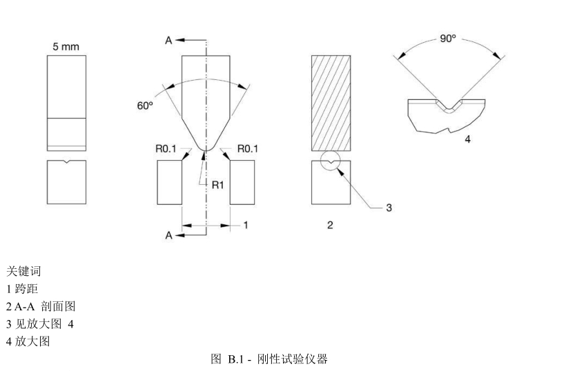 B.2.1 刚性试验仪器通过一个下端呈钝楔形的、倾斜平面夹角为 60°、半径为1mm、宽度至少为 5mm的推杆将最大限度为60N,精度为士0.1N的向下垂直作用在针管上。图B.1示例出适用的仪器。