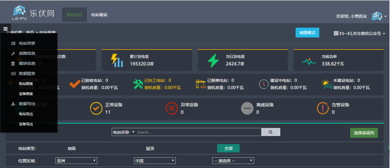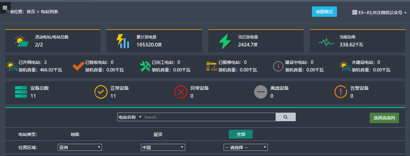 用户权限范围内的光伏电站地理分布图,以及各个电站的总体绩效与通讯概况: