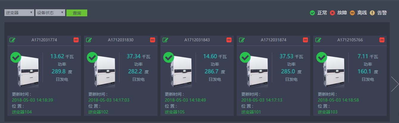单个电站逆变器状态的展示与统计,是单电站监控最常用的功能: