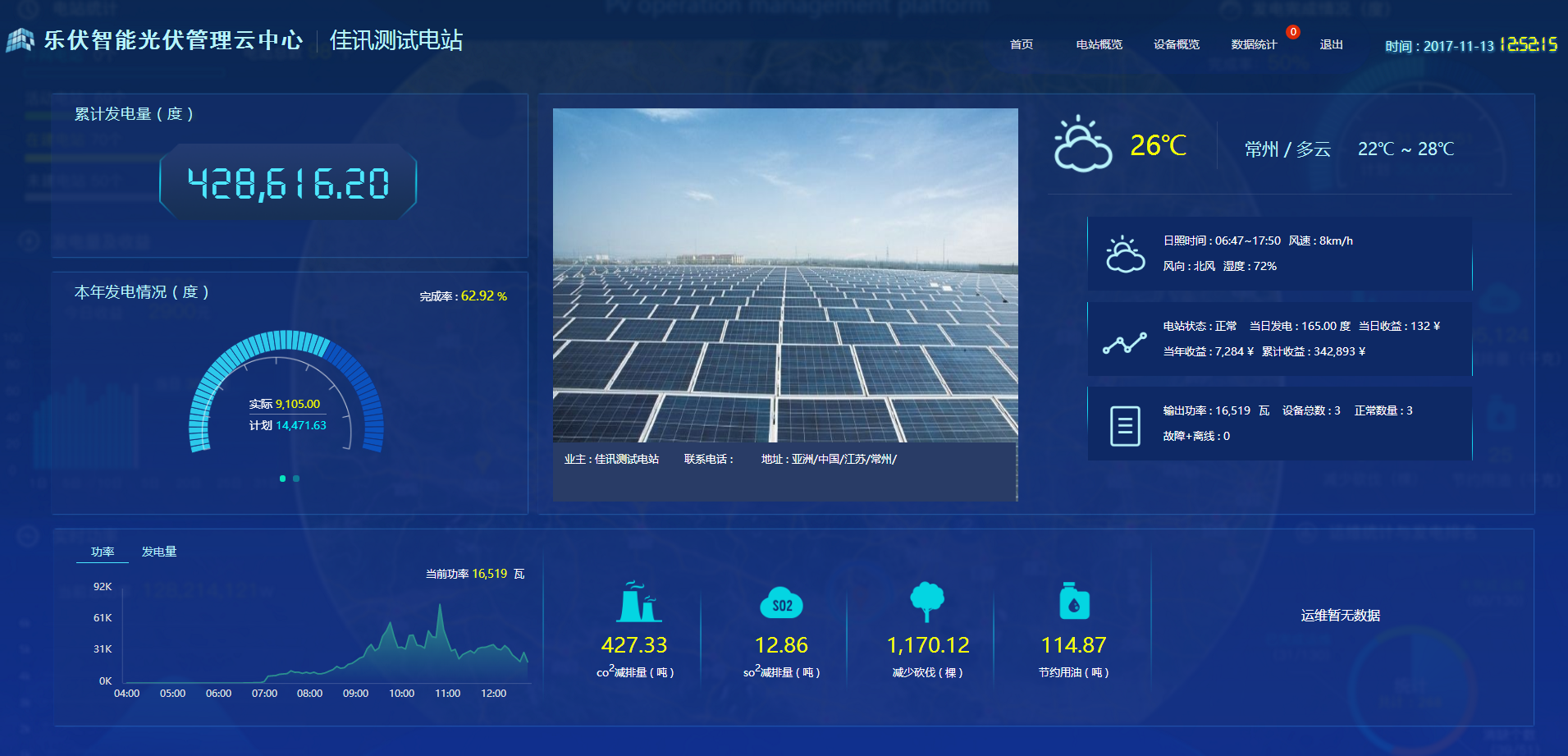 乐伏运维监控系统是建设符合用户实际需求的在线监测系统,系统完成了整个武乡县扶贫电站数据采集装置的安装,实现从电能表、逆变器等采集数据,远程传输数据至平台,数据统计与展示的功能。整个系统包括数据的原始采集、数据的在线传输、数据的在线分析诊断等。通过GPRS导轨采集器、规约机的安装采集逆变器、电表数据,实现光伏能耗数据的采集,在线传输;通过采集气象站的实时数据和通过网络获取当地历史气象信息,形成可视化趋势,通过调节控制逆变器,确保发电在可控范围内,保证电网稳定运行。
