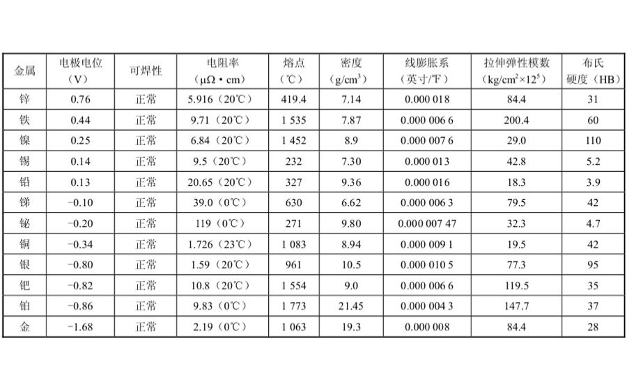 1.材料的选择一个焊接接头系统主要由3要素构成,即基体金属、助焊剂和钎料合金。为了获得良好的焊接连接,这3种材料必须完全匹配。(1)基体金属。设计焊接组装件时,要考虑与焊接有关的基体金属特性,如表1所示。表1 常用的基体金属特性(以电化序大小排序)