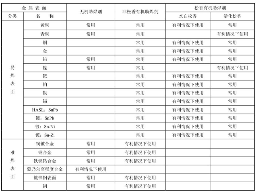 ●腐蚀的可能性:电极电位是一个重要因素,如果存在电离液体,则基体金属间或基体金属与钎料之间电位差高的场合会产生腐蚀现象。●在小型和精密组装中,要关注所选用的基体材料和钎料的热膨胀系数的匹配问题,以确保组装件在温度变化的情况下应用时不产生应力和尺寸变化。●因受热和冷却而产生的损坏现象称为热疲劳。热胀冷缩是产生热疲劳应力的原因,不管这些应力发生在哪个部位,它都将使焊缝中的钎料连续位移。如果钎料是可延展的,而且润湿良好,虽然焊缝表面应力集中的部位有时会产生结霜现象,但焊接接头不会损坏。●表1中的可焊性是指金属表面的可焊性,不包括为改善可焊性而具体采取的表面处理措施。(2)正确选用助焊剂。为了确定焊接所需要的助焊剂类型,可按下述两步考虑。① 助焊剂选用。在工程应用中电子组装所用助焊剂的选择可参考表2进行。