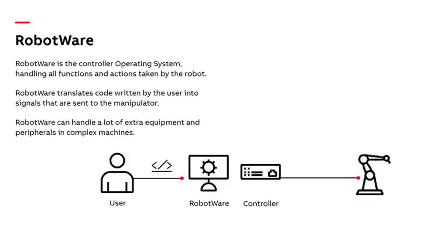 RobotWare是ABB Robotics的系列软件产品,可以把它理解为是ABB机器人所使用的一种操作系统。它包含了不同的产品类型,如RobotWare-OS(机器人的操作系统,为机器人编程和运行提供必要功能)、RobotWare选件(在RobotWare-OS上运行的选项,提供附加功能,如动作控制、通信、系统工程或应用等)、生产应用选件(针对特定生产应用的扩展包,如点焊、弧焊等,用于提升生产成果和简化应用的安装与编程)以及RobotWare Add-ins(用于扩展机器人系统功能的开发工具)。