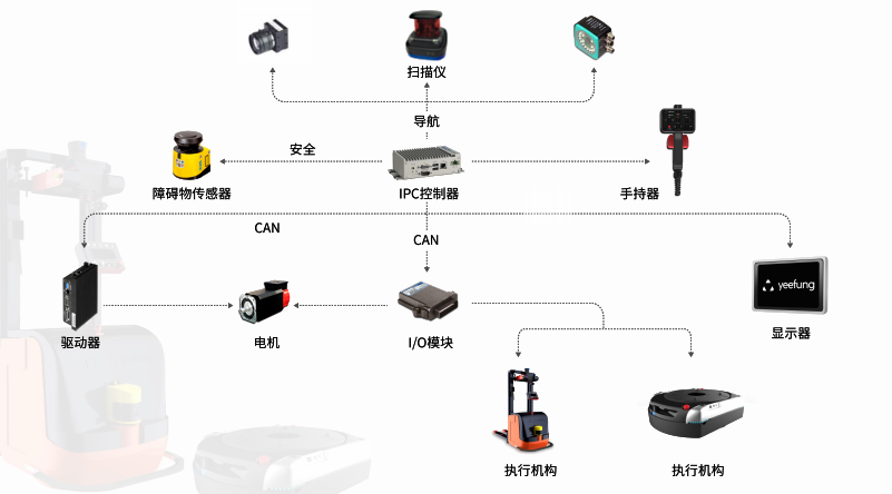 按导航/导引方式分类,包括了激光导航、自然导航、视觉导航、磁带或词条导引、磁钉导引、二维码导引,另外复合导引可使定位更精确,如激光+磁钉。