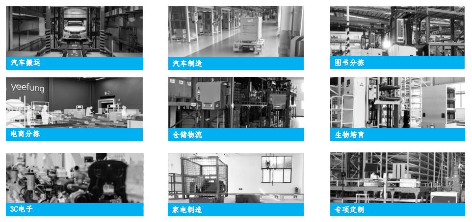 AGV专业搬运,应用场景包括了汽车搬运、汽车制造、图书分拣、电商分拣、仓储物流、生物培育、3C电子、家电制造、专项定制等。