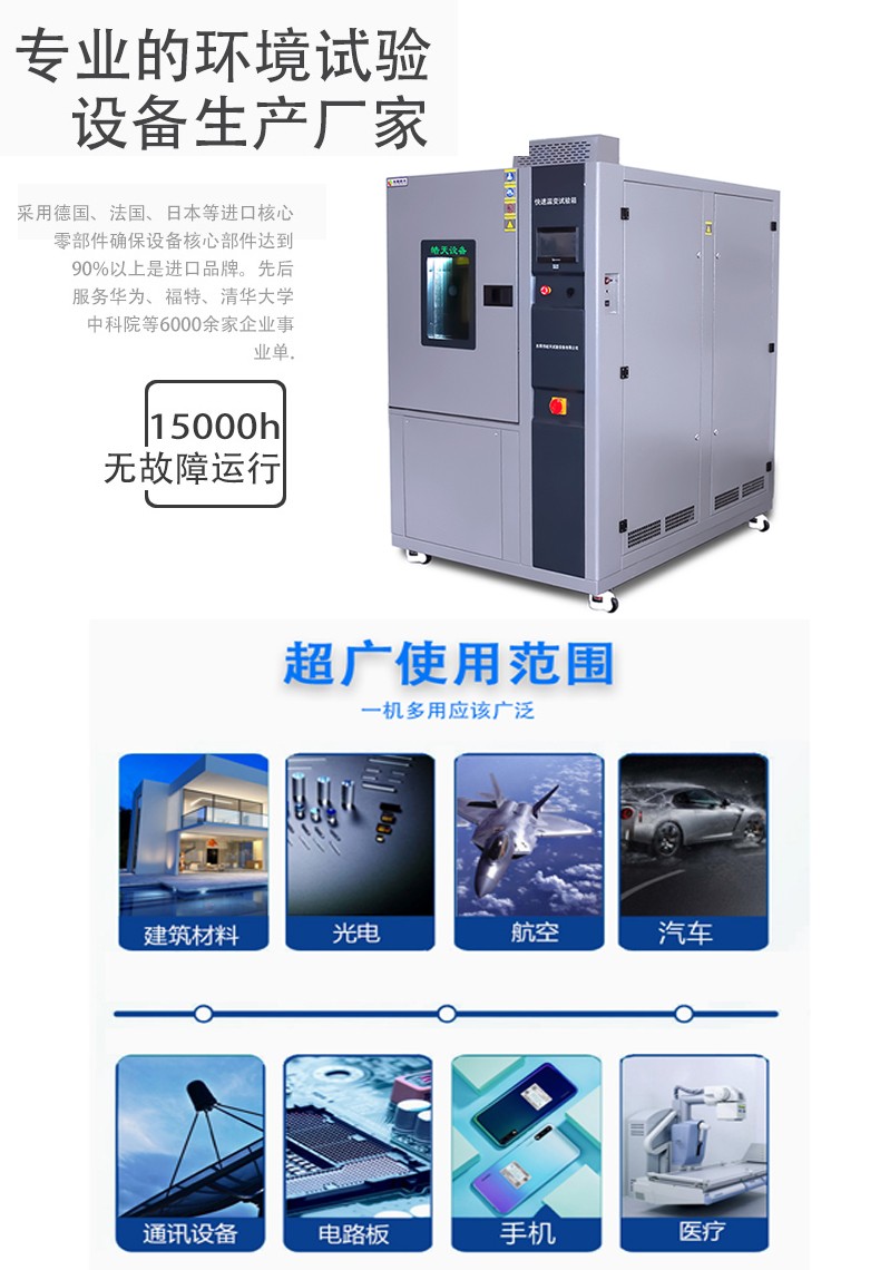 4. 快速温变高低温试验箱:温度变化率可达到±20℃/min,用于测试产品在快速温度变化下的性能表现和稳定性。