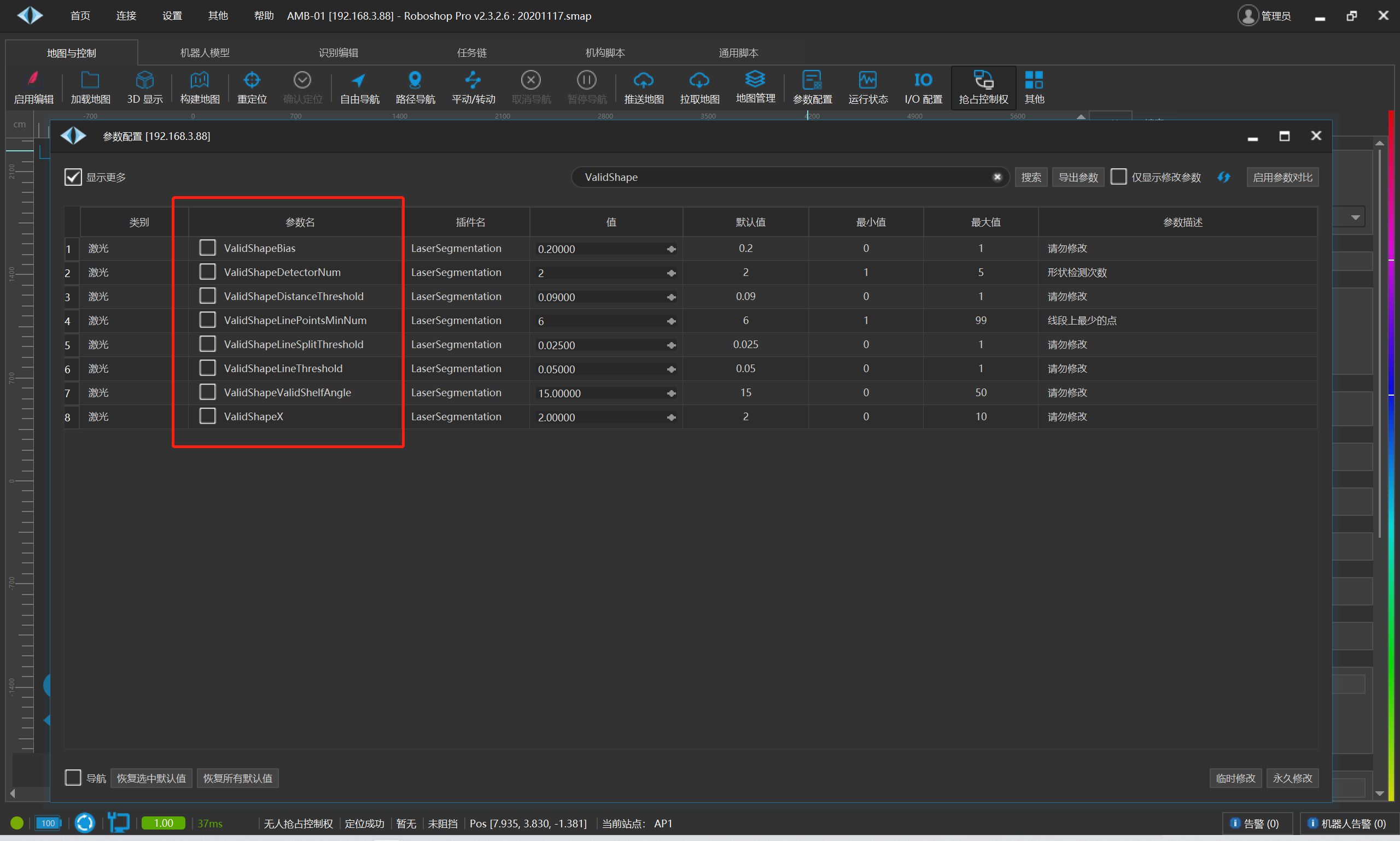 ValidShapeDistanceThreshold:该值代表着识别算法内部计算出来的货架腿之间的距离和实际距离之间的差值;