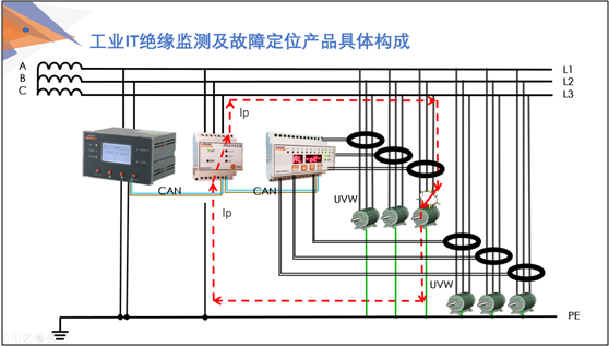 下图为AIM-T500L系列绝缘监测及故障定位系统的原理图,当末端回路发生绝缘故障,绝缘监测仪开始报警,并通知信号发生器和绝缘故障定位仪,信号发生器向故障回路注入信号,绝缘监测仪监测故障回路,当绝缘故障定位仪检测到故障后,绝缘监测仪界面显示故障相线和故障回路。